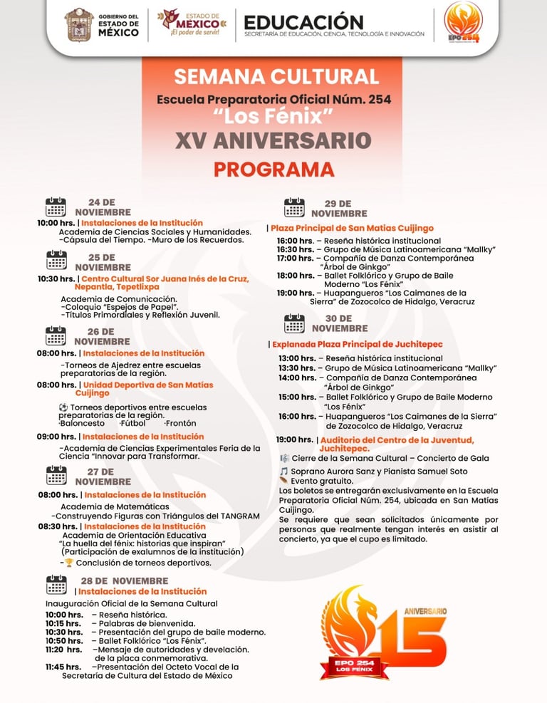La Semana Cultural de la EPO 254 “Los Fénix” reúne una amplia variedad de eventos académicos, artísticos, deportivos y recreativos diseñados para celebrar el XV aniversario de la institución.